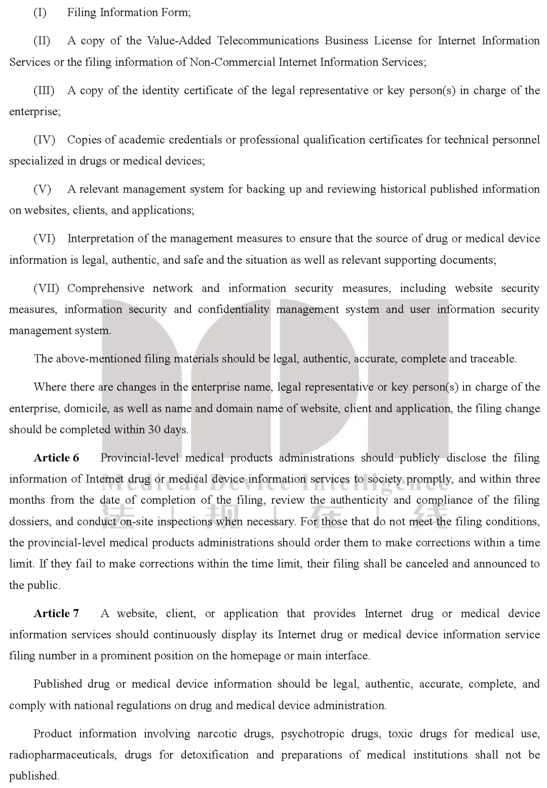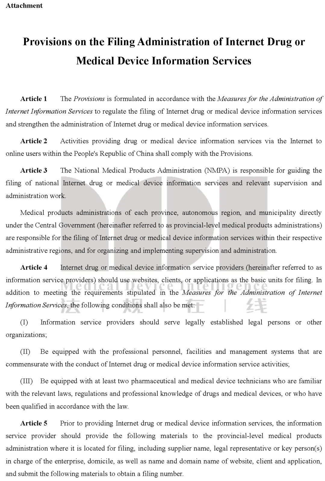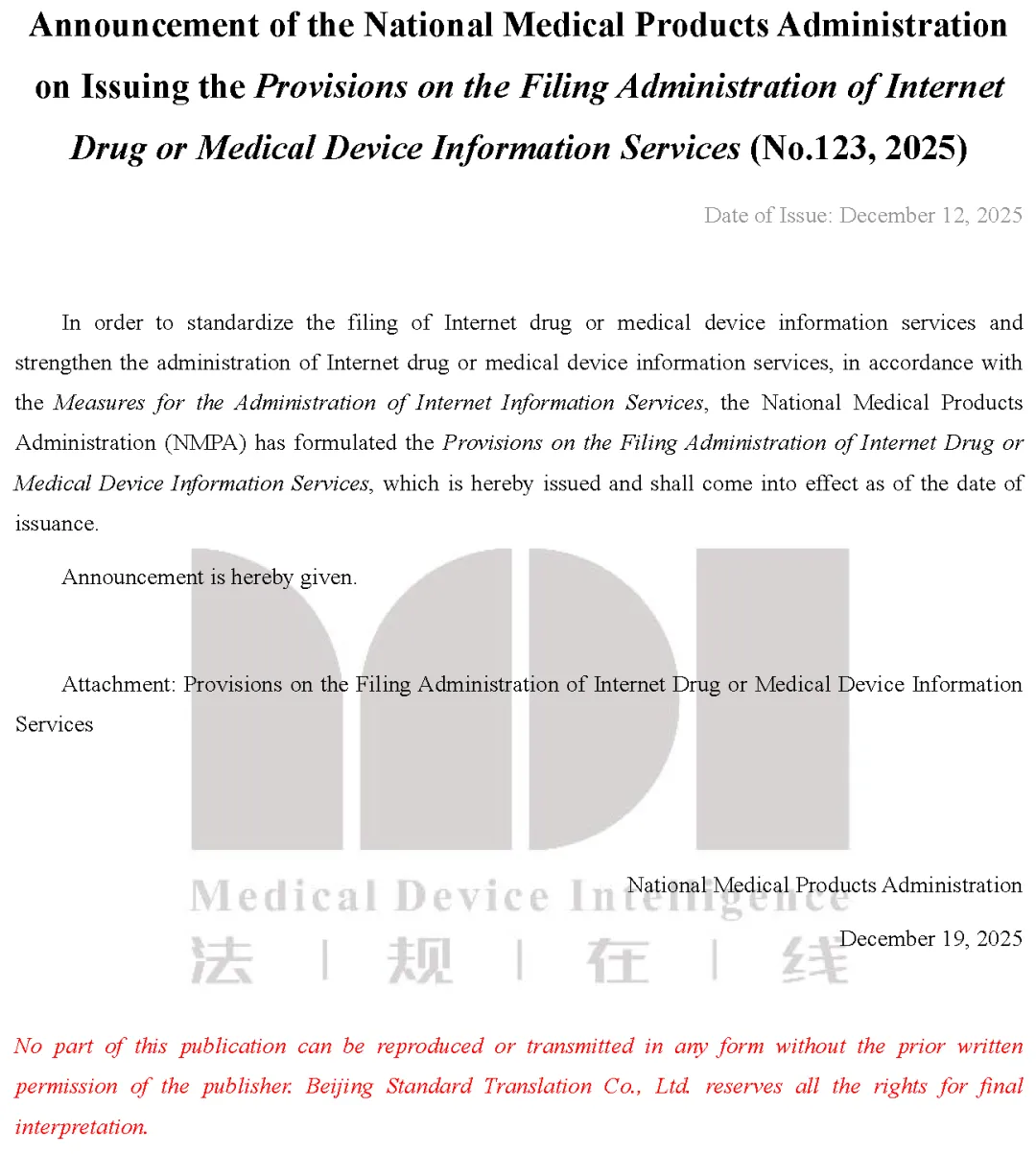 Announcement of the National Medical Products Administration on Issuing the Provisions on the Filing Administration of InternetDrug or Medical Device Information Services (No.123, 2025)