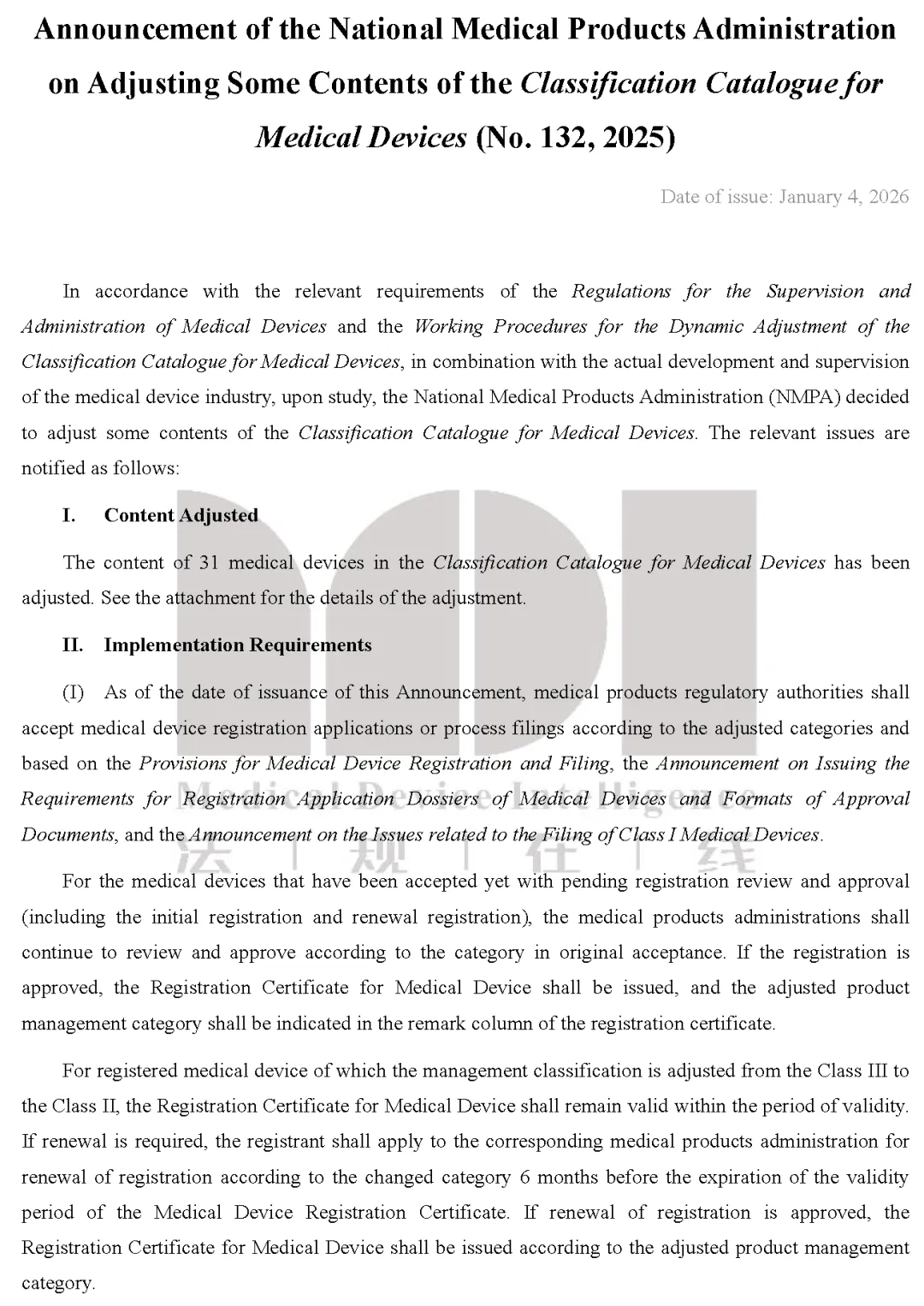 Announcement of the National Medical Products Administrationon Adjusting Some Contents of the Classification Catalogue forMedical Devices (No. 132, 2025)