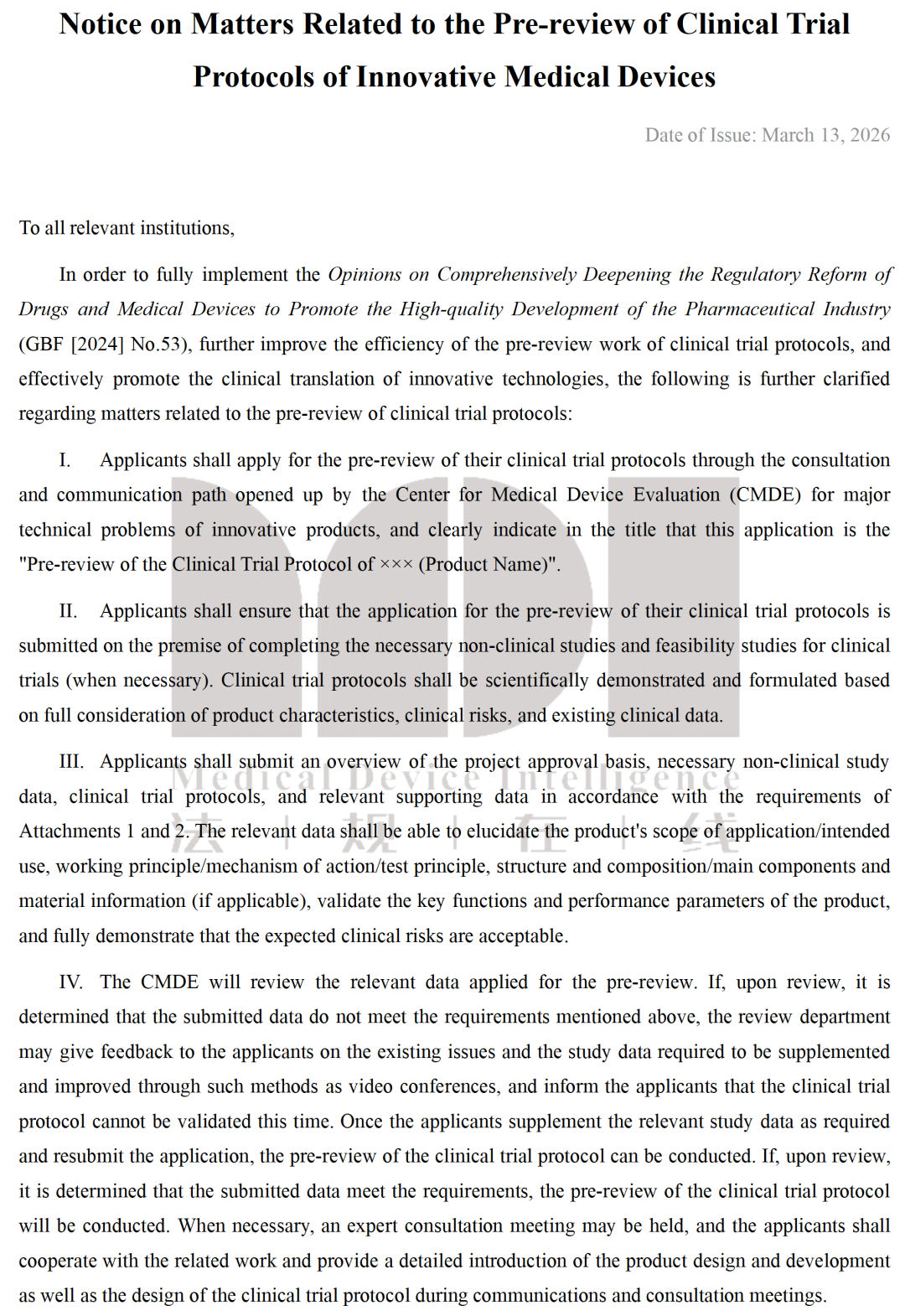 Notice on Matters Related to the Pre-review of Clinical TrialProtocols of Innovative Medical Devices